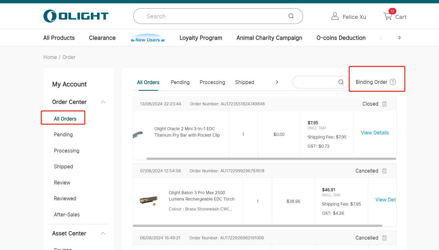 • To bind your order: Go to My Account > Order Center > All Orders, click the Binding Order button, and enter your previous order number.
