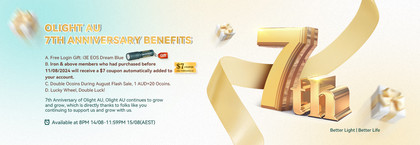 For Olight AU’s 7th anniversary, we’re celebrating our growth and success, thanks to the incredible support from our community. Your continued patronage has been instrumental in our journey, and we're excited to share these special offers and new products as a token of our appreciation. Thank you for growing with us!