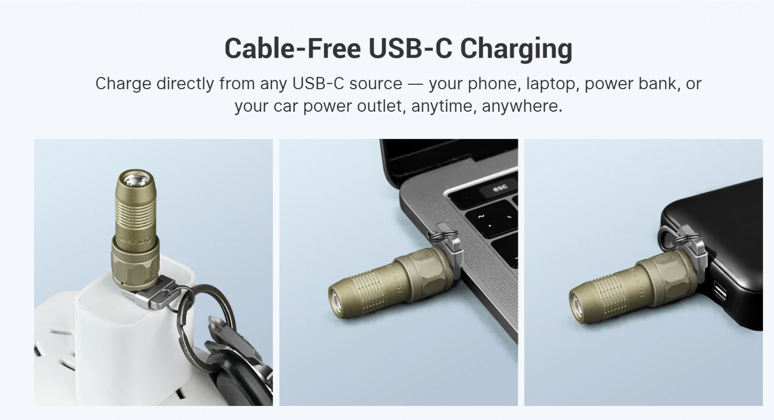 This system allows you to charge the iUltra without detaching it from your keychain, using the same cables you likely already carry for your phone and other devices. It's the ultimate in charging convenience for a modern EDC flashlight.