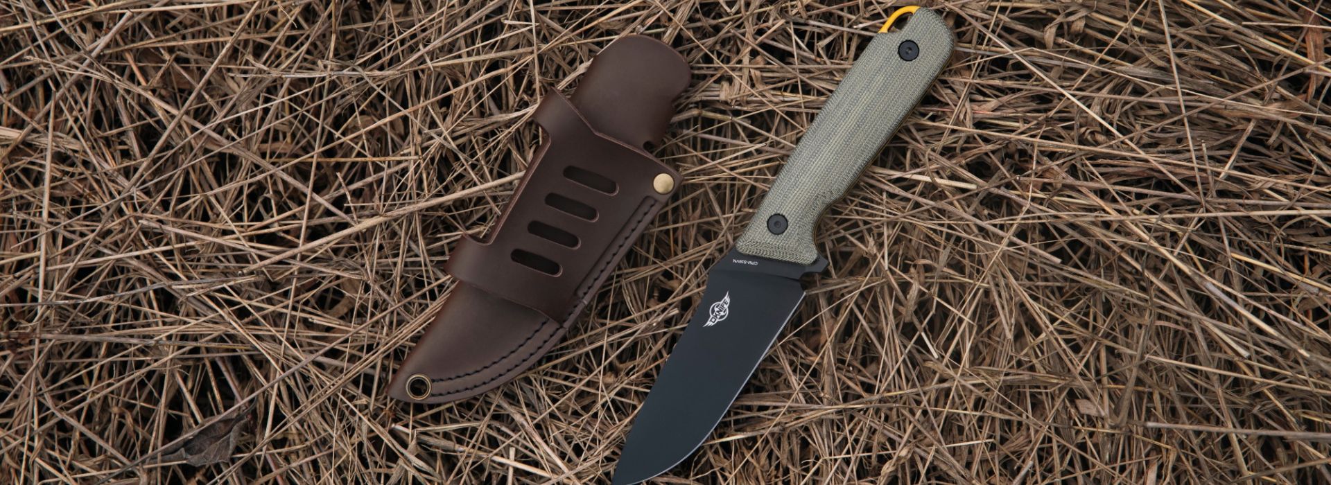 The Fortitude 2 is a fixed blade knife with a robust 3.7 mm thick full-tang blade made from CPM-S35VN powder steel and coated in matte black titanium. Its handle, designed for enhanced grip, is crafted from OD green Micarta and yellow G10. For portability, the knife comes with a versatile two-layer leather sheath that can be carried both horizontally and vertically on a belt.
