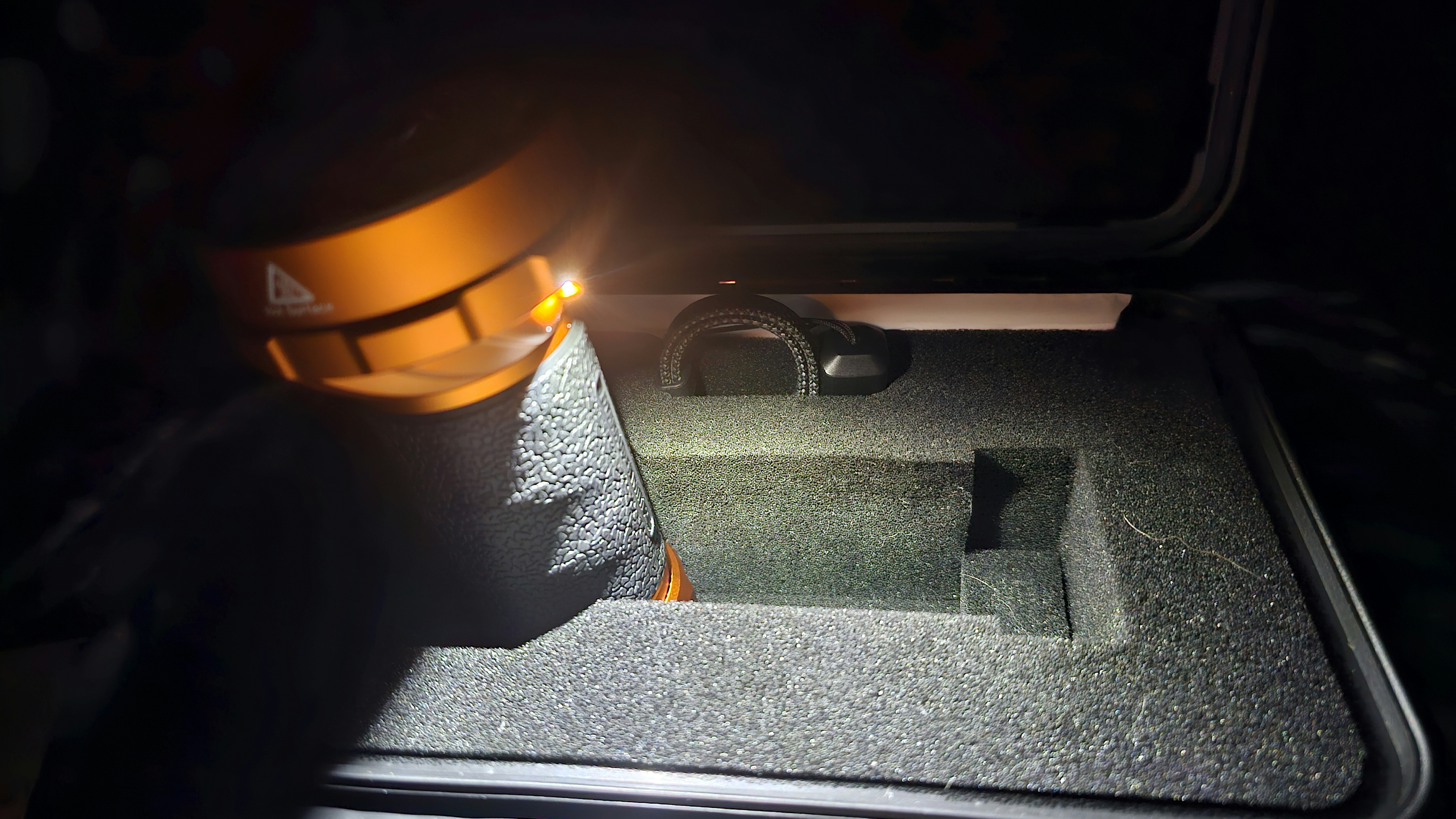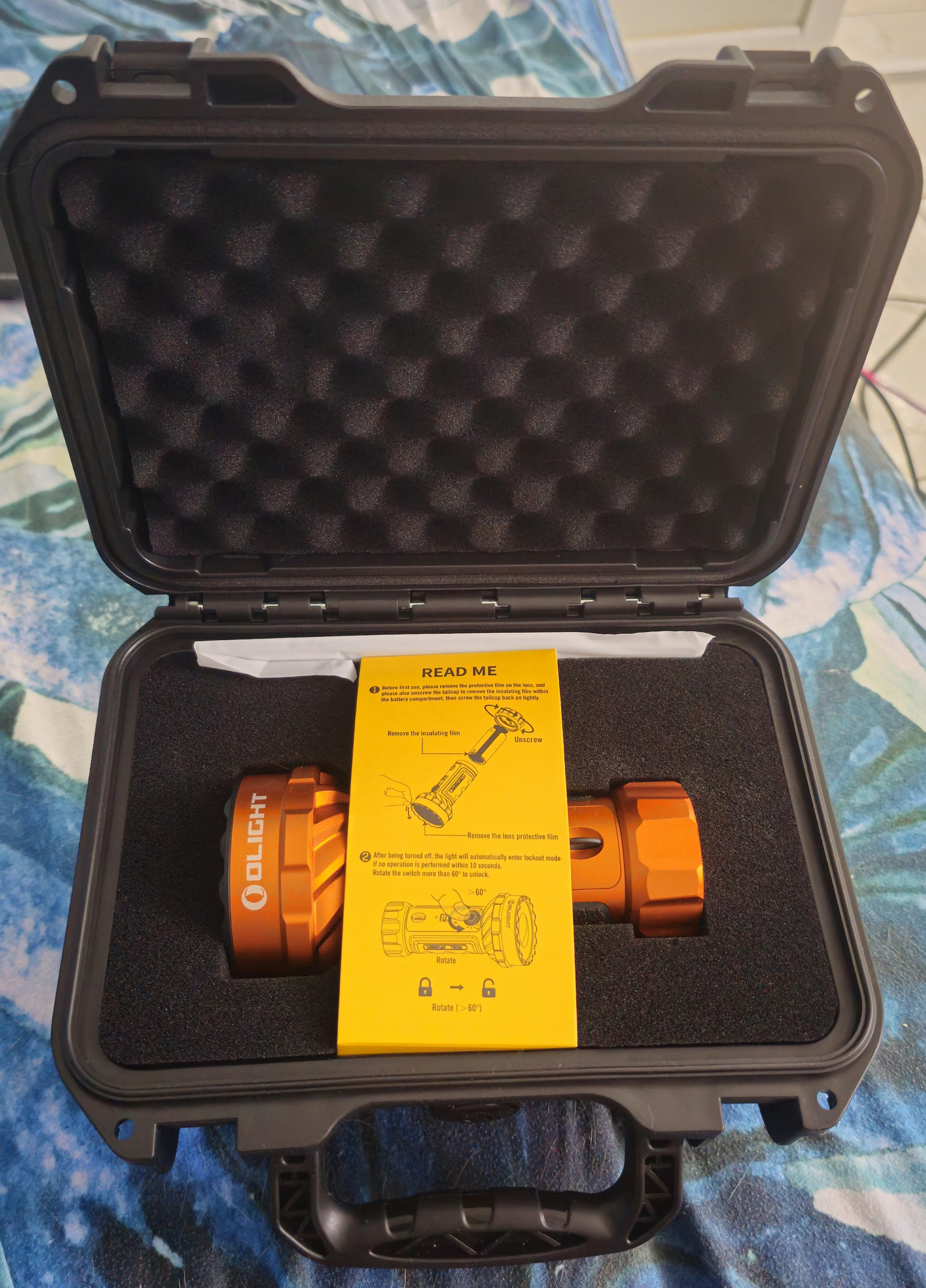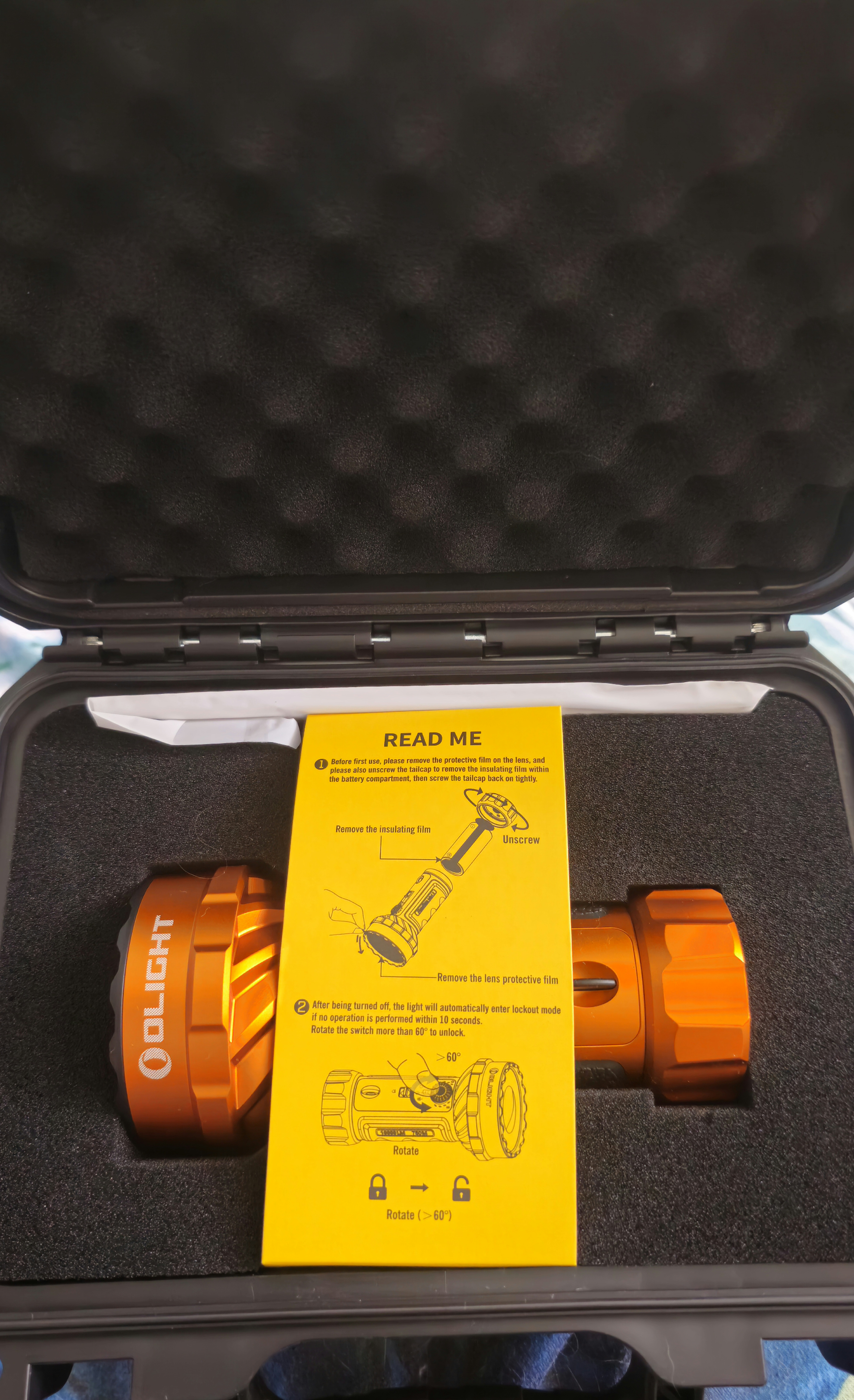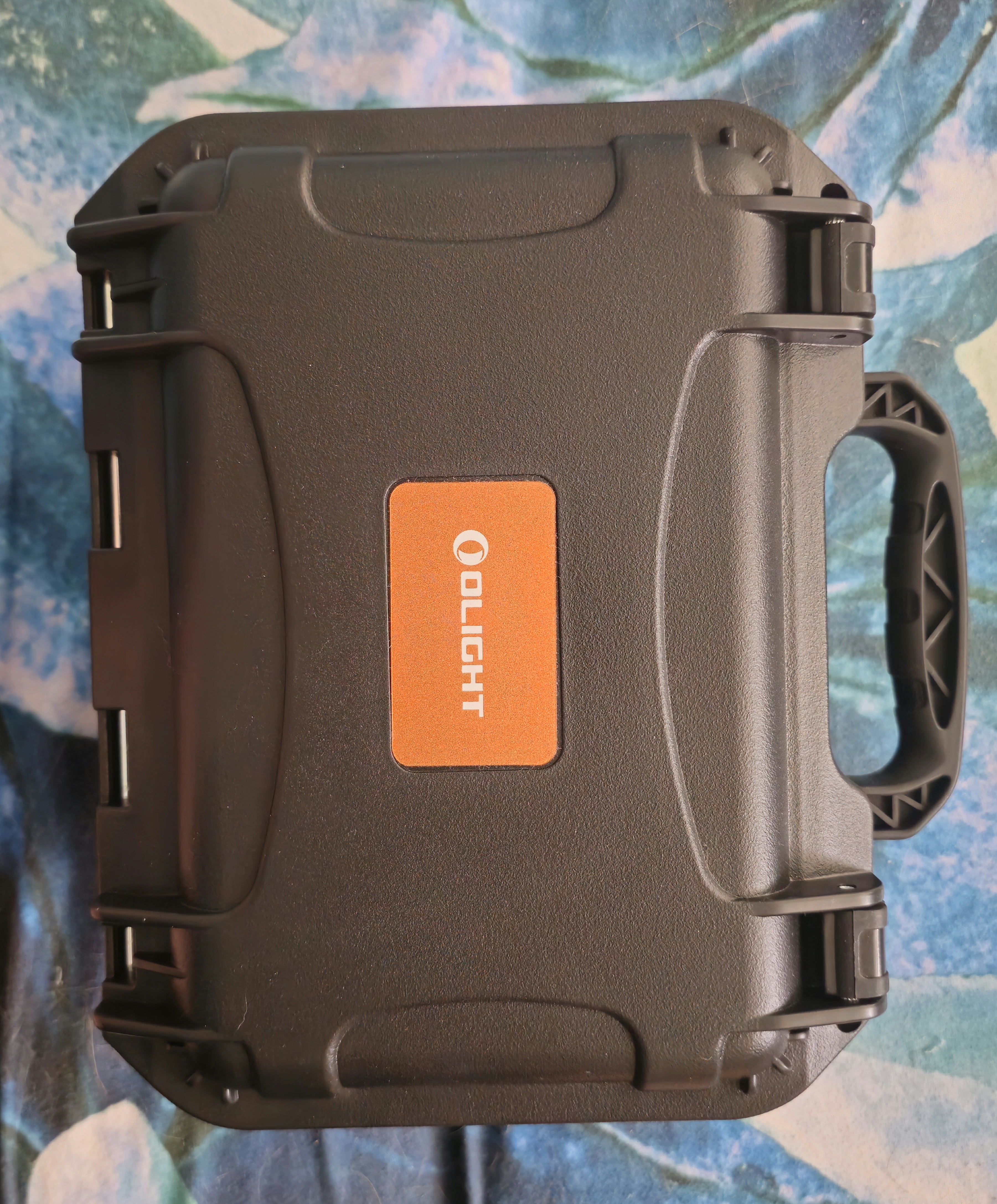 As usual, shipping was easily tracked and arrived in record breaking time. It arrived in a pretty unassuming brown cardboard box, but when I opened it up, inside was this beautiful, black, tactical looking pelican style case with the orange Olight badge on top! It feels very sturdy and has a nice solid carry handle. The locking clips also seem nice and durable too which is a huge plus because that is usually the first thing to go on these types of cases.