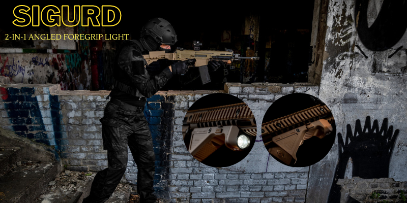 Sigurd is an innovative angled grip light with a Picatinny rail mount. It combines the ergonomic advantage of an angled grip with a 1450-peak-lumen light into one sleek device. The ergonomically angled grip features anti-slip grooves and finger stops, providing a comfortable grip while also insulating the heat between the barrel and hand. This product adopts the popular Picatinny rail mounting system and can also be mounted to M-LOK rails with a Picatinny rail adapter.