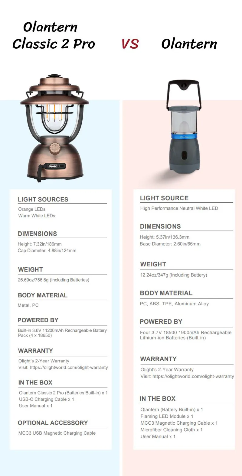 ☑️There are two different light modules available for the lantern classic 2 Pro, a warm orange module and a warm white module. The Olantern has two types of lighting modules: warm light and flaming light. From the table below, we can see that the Olantern Classic 2 Pro can work for 180 hours at maximum, which is a lot longer than Olantern. It's a great upgrade for Olantern series. So this product can meet your requirements for staying outdoors for longer than a week.