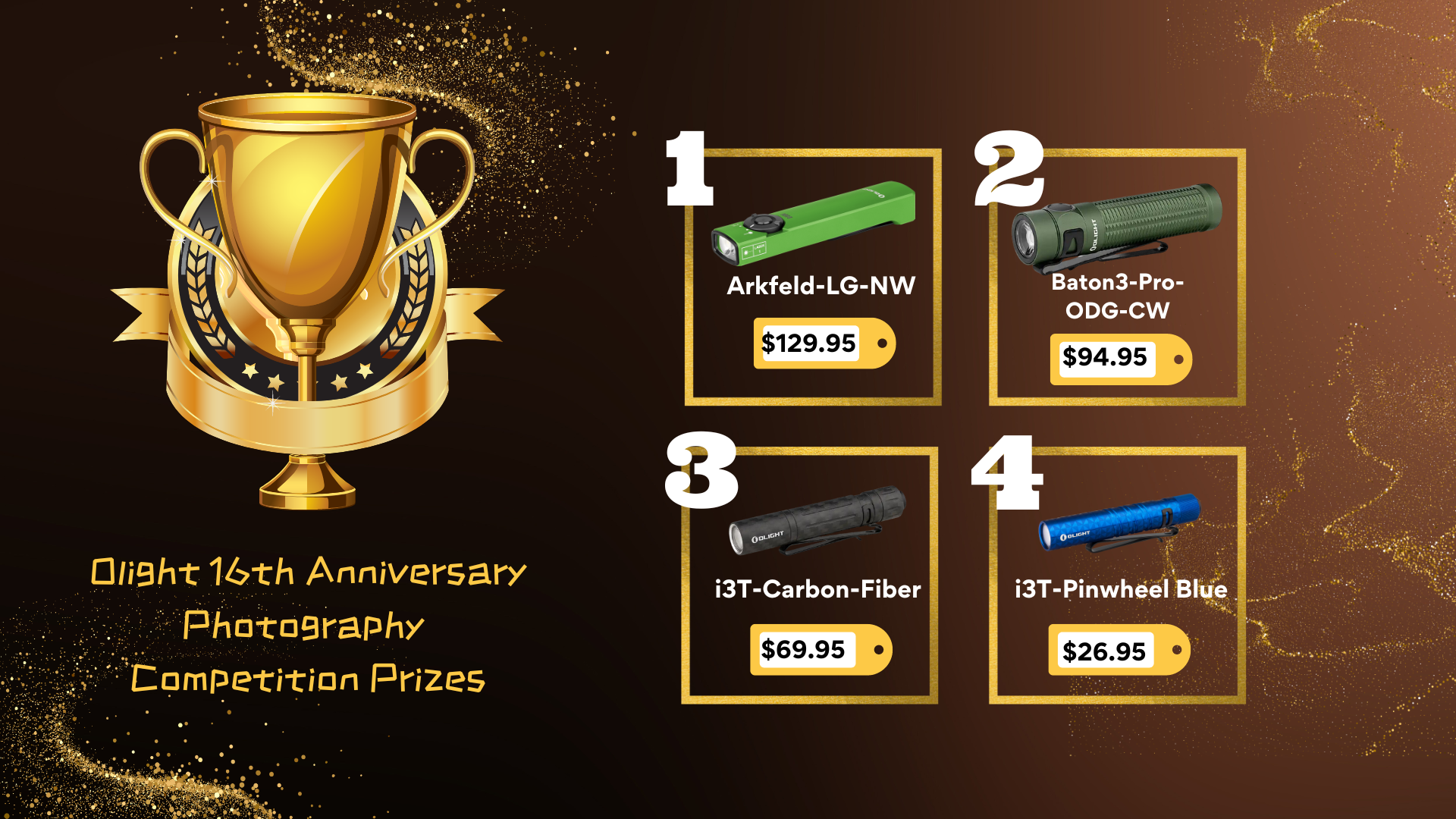 In celebration of our organization's 16th anniversary, we are excited to announce a Photography Competition that invites all customers to express their creativity by capturing captivating images of their beloved Olight products. Let's celebrate together through the lenses of our cameras by sharing the joy of creation. Click here to join now>>>