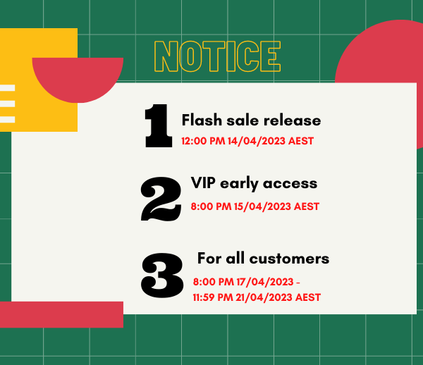 VIP members (Silver and above) have early access to the sale starting at 8:00 PM on 15/04/2023 AEST. For all customers, the sale will open at 8:00 PM on 17/04/2023 AEST and will be until 11:59 PM on 21/04/2023 AEST. Please make sure to mark your calendars for our upcoming 16th Anniversary Flash Sale!