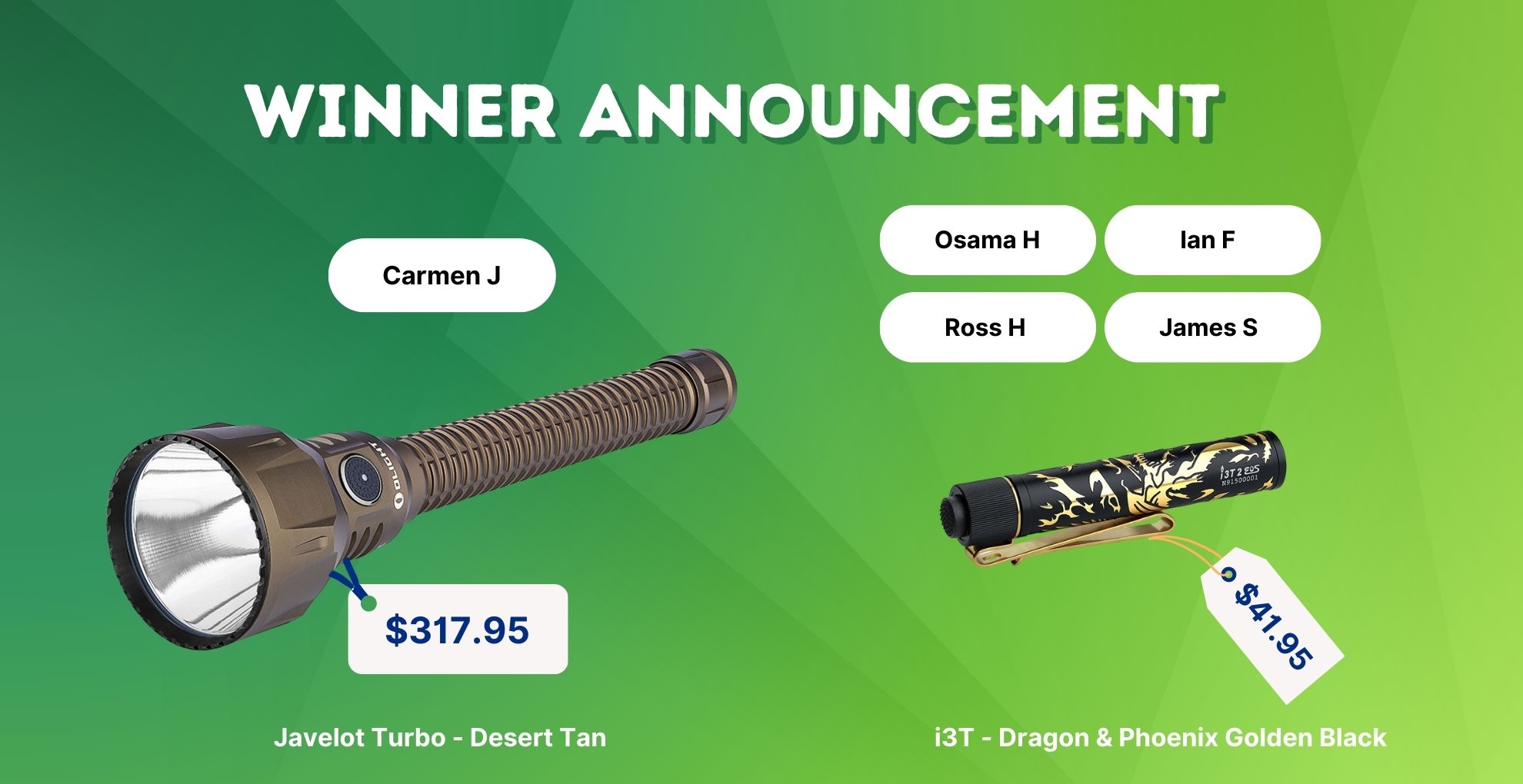 We will randomly select five lucky winners to receive an Olight torch as a gift, and one of them will have the opportunity to win the Javelot Turbo - Desert Tan (Worth $317.95)!