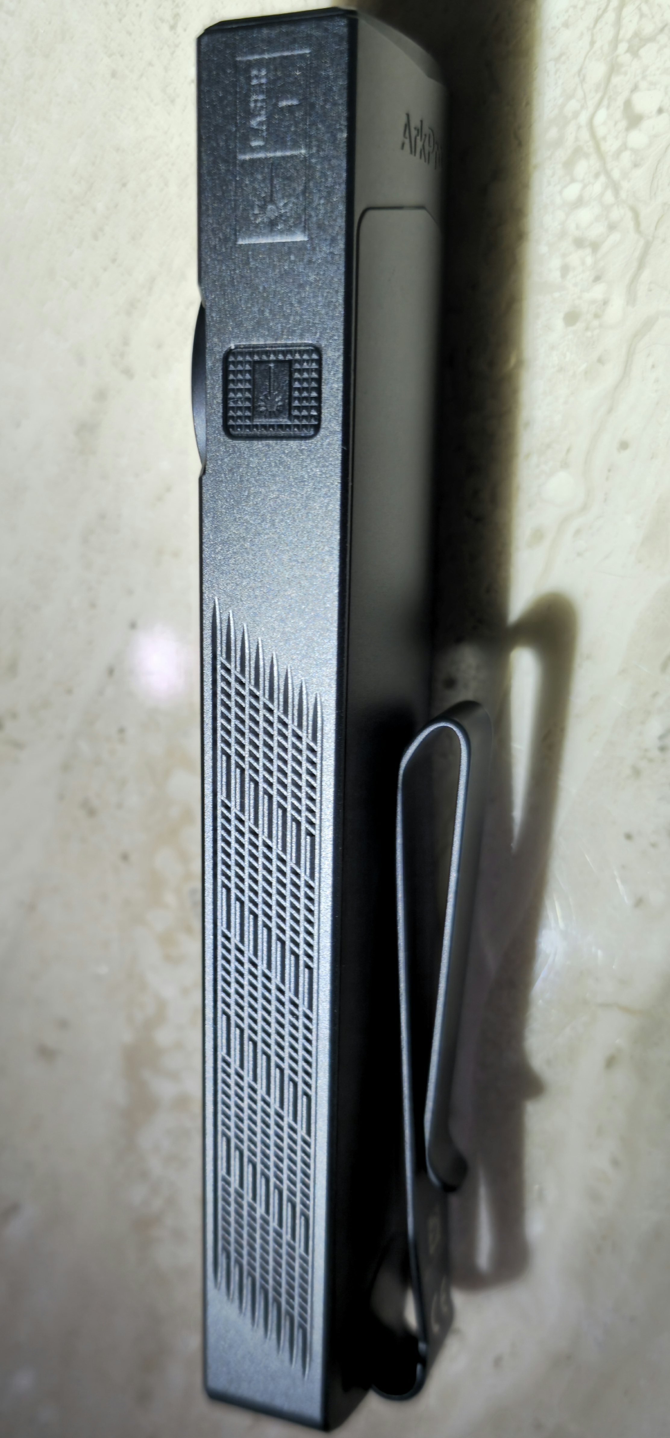 The laser function is now operated via a separate button on the side of the Arkpro and can be momentarily turned on by holding the button in or turned on/off manually by just pressing the button. This new design makes it faster and easier to operate and also means you can combine it with the other light functions of the Arkpro. 3+1=7 as they say.