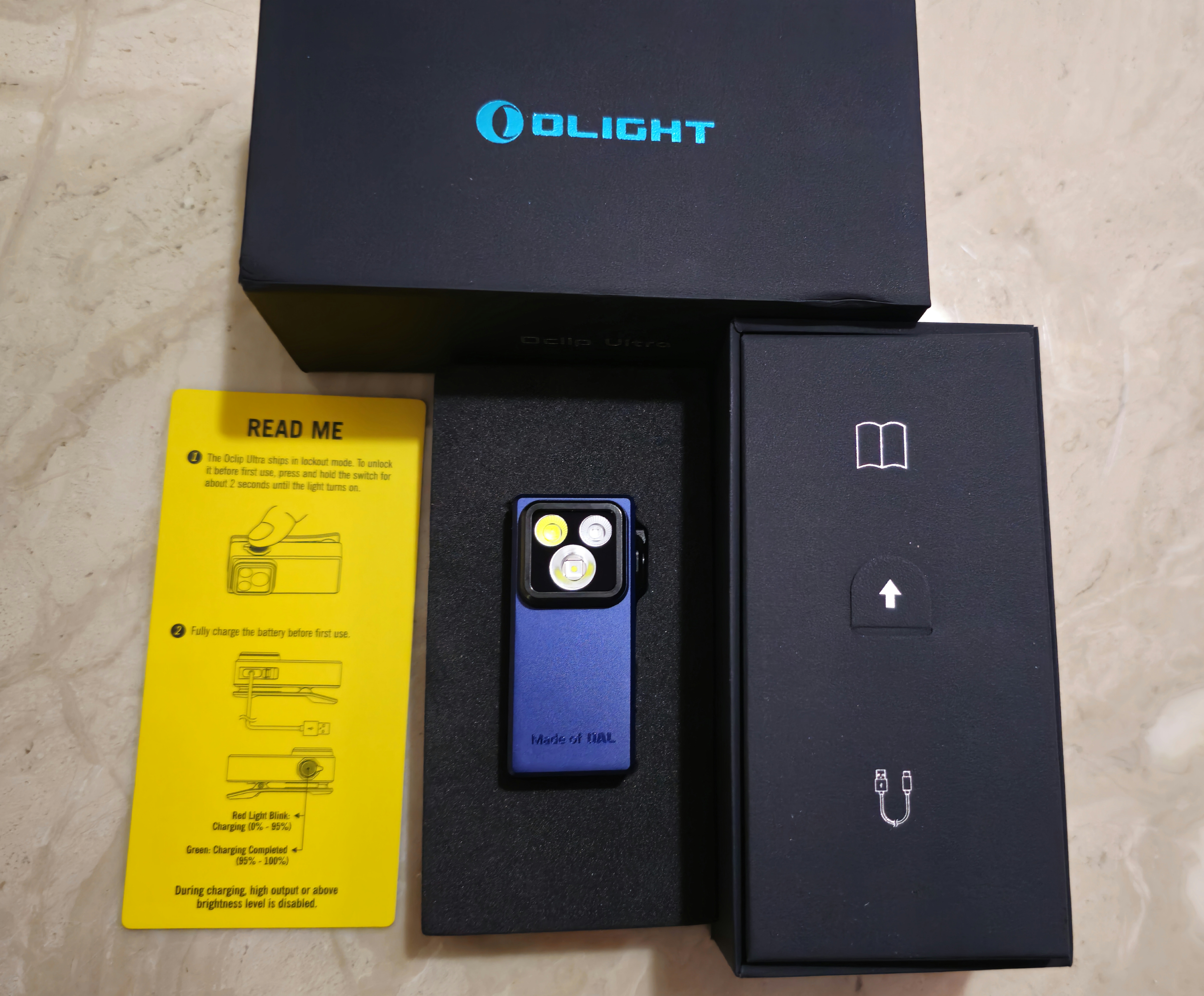 Inside the box was the Oclip Ultra in an opaque protective sleeve and set inside a foam insert. Below that was a thin cardboard box containing the instructions and charging cable along with a yellow “Read Me” sheet which explains the lockout mode and charging instructions. It also has a very nice message from Olight on the back of it which is a really nice touch!