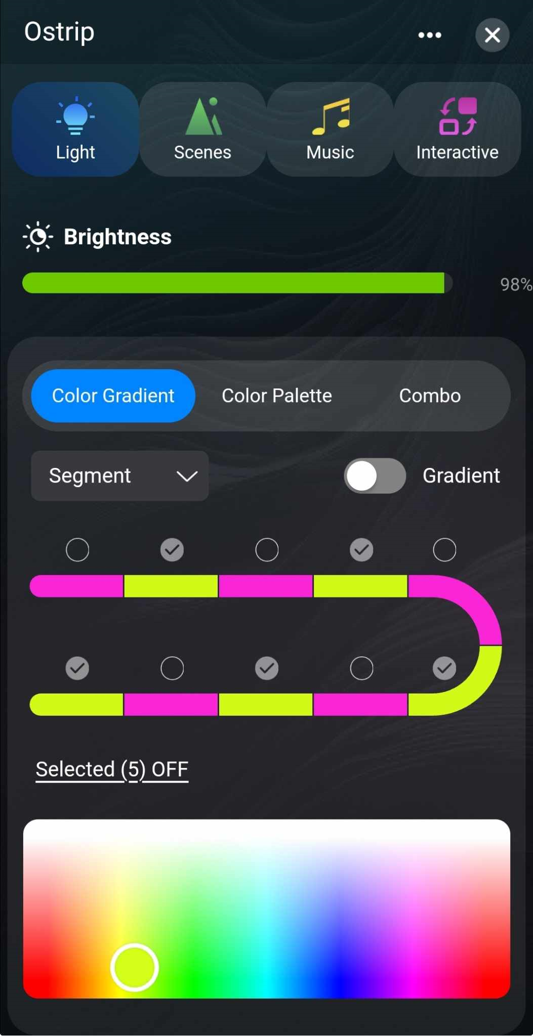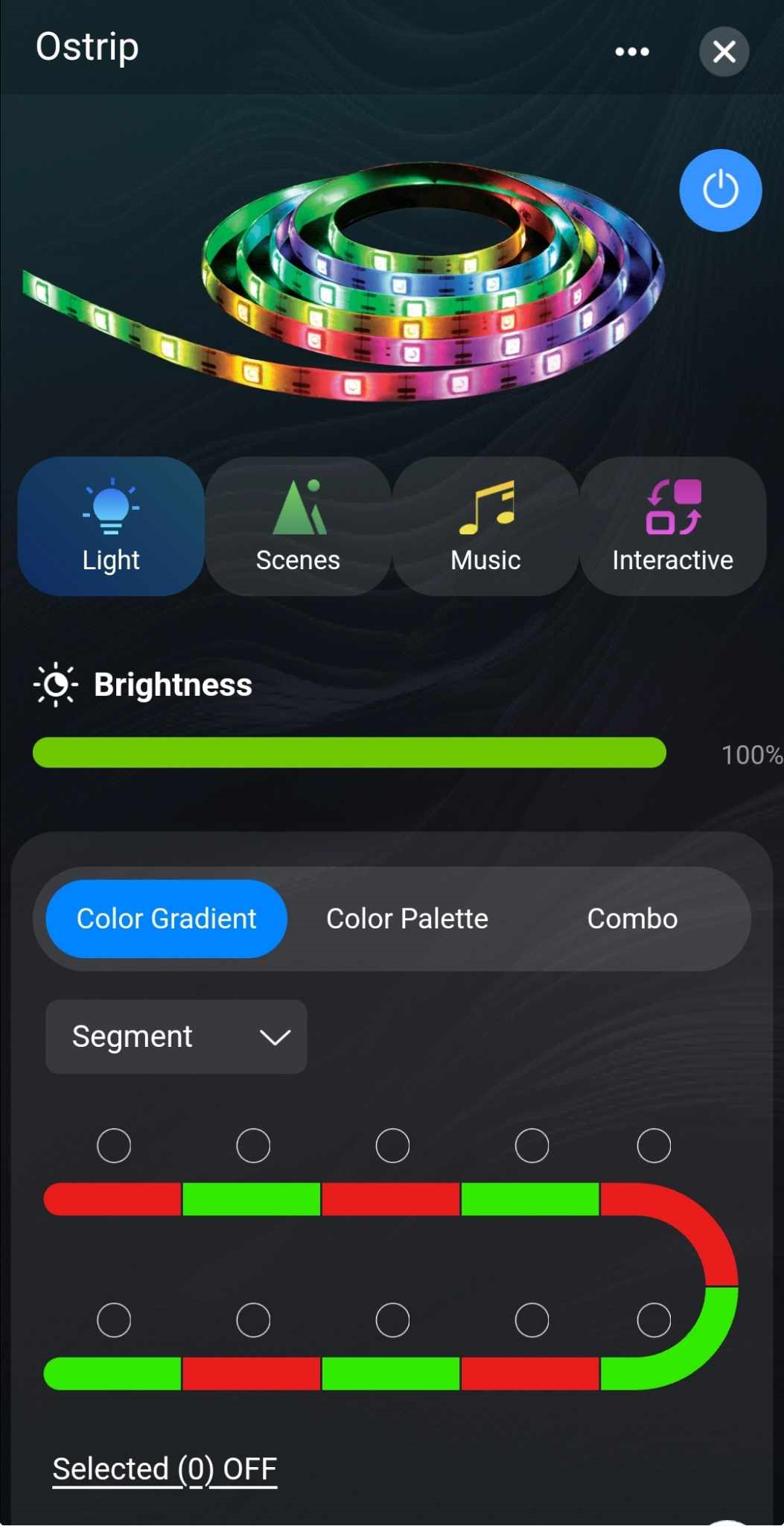 Previously, with the Olight Sphere, you needed to install the Olight Hub app, now you just install the one Olight app, which you can find on your phone’s app store. To connect, open the app and choose the setting allowing you to add a light, and click the switch on the Ostrip 3 times until it is flashing green. Then you will get an option to choose the Ostrip, it will connect via Bluetooth, and you will see this screen: