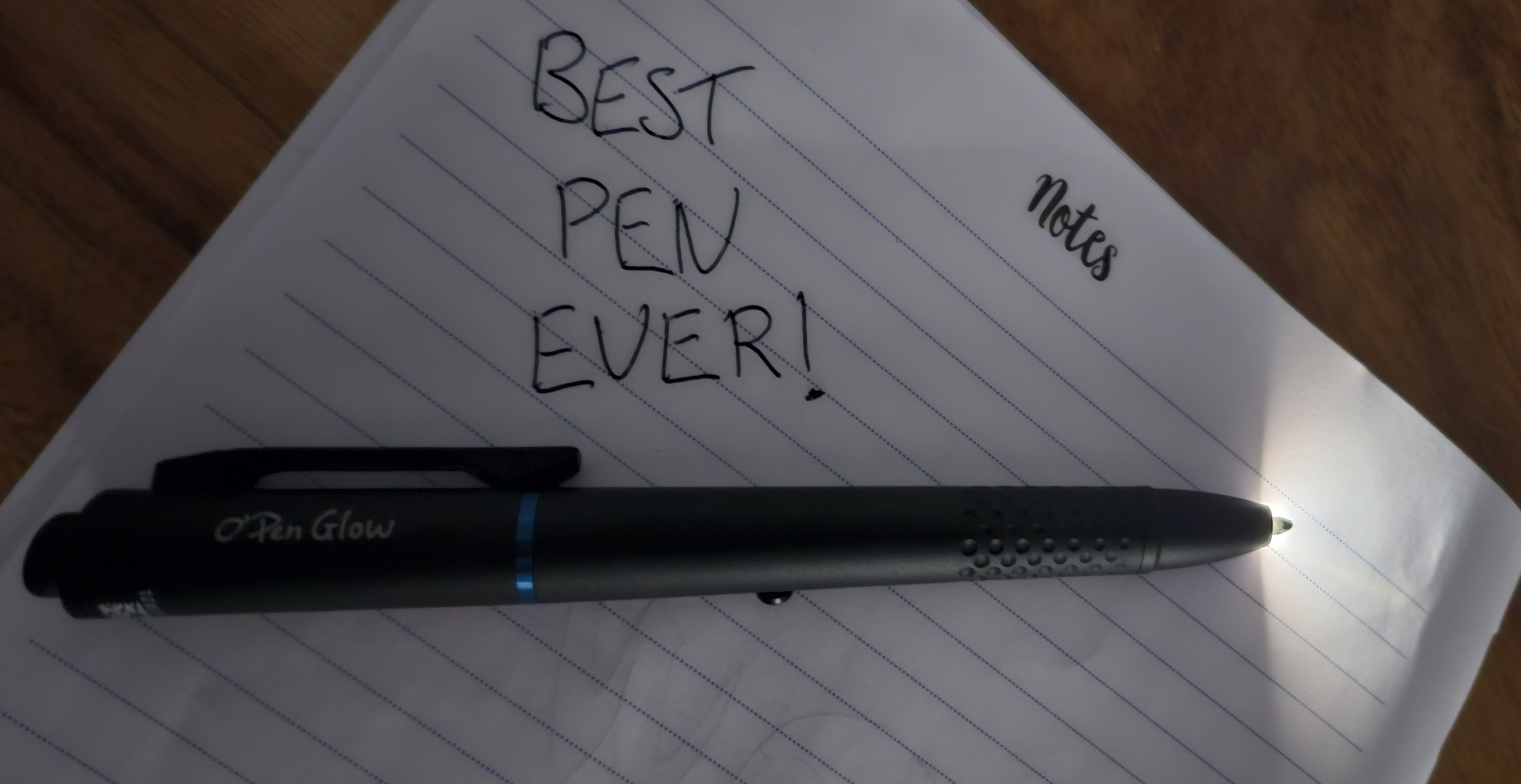 Speaking of which, clicking in the tail switch while the writing nib is retracted activates the LED Clip Light. The light modes range from 5 to a maximum of 120 lumens and it is powerful enough to light up a surprisingly large area. I have used this several times to walk around outside at night and have found its performance to be very impressive. You can also unscrew the top half of the pen and use it as a light while you write with the bottom half of the pen which is a great feature if you need to do two things at once. When it comes to writing in the dark though, the Open Glow has another trick up its sleeve. Clicking the tail switch in while the writing tip is engaged activates the pen tip light. This is perfect for taking notes during video presentations or writing down ideas you have in the middle of the night without the risk of disturbing your partner.