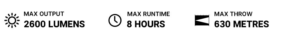 Remarkable Performance: Max output: 2,600 lm; Max throw: 630 m; Peak beam intensity: 99,310 candela.